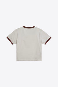 THIS BABY TEE HAS A SHRUNKEN FIT WITH A SLIGHTLY CROPPED BODY LENGTH HITTING JUST AT THE WAIST LINE.