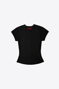 THIS BABY TEE HAS A SHRUNKEN FIT WITH A SLIGHTLY CROPPED BODY LENGTH HITTING JUST AT THE WAIST LINE.